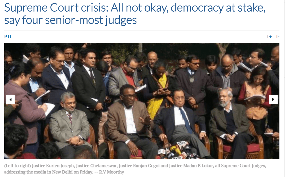 On 12th Jan 2018, 4 Supreme Court Judges, Justices Jasti Chalameshwar, Ranjan Gogoi, M B Lokur and Kurian Joseph called for press conference to inform the public about the improprieties in court operations and proceedings. They complained about selective assignment of cases, in a way that threatens the democracy. All the while maintaining the court’s decorum they expressed anguish about the state of country and its democracy. As the cases being heard were so important they felt the compelling duty towards the country to come out in protest of CJI.